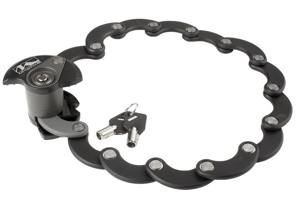 Цепь–это самый универсальный вариант, который позволяет прикрепить велосипед к любым перилам (в том числе к необычной форме). С его помощью закрепляют не только один, но и два или три велосипеда. Цепь–это более надежный замок, который невозможно взломать с помощью случайных инструментов. Внутри идет стальная или каленая цепь, сами звенья круглые или квадратные. Покрытие – тканевое или резиновое. Некоторые модели имеют светоотражающий кожух. Толстые цепи на амбарном замке могут считаться самой надежной защитой. Спилить защиту возможно только с инструментом болгаркой.